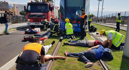 Periódicamente nos formamos para ofrecer un servicio de calidad, pero también para afrontar situaciones de emergencia que pudieron registrarse en el servicio del tranvía. Uno de los recursos utilizados para este tipo de preparación es el simulacro, como el que realizamos en el mes de junio con el objetivo de coordinar actuaciones entre nuestros departamentos y 112 Canarias, Consorcio de Bomberos de Tenerife, Protección Civil del Ayuntamiento de Santa Cruz, Servicio de Urgencias Canario, vocal de Crisis, Emergencias y Desastres del Colegio Oficial de Psicología así como Policía Local de Santa Cruz.