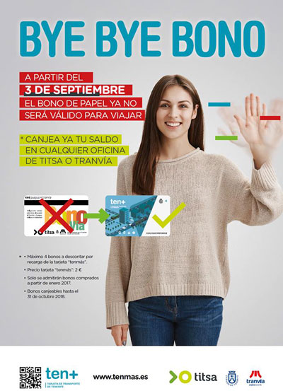 El Cabildo Insular de Tenerife lanzó la campaña ‘Bye Bye Bono’ para informar que el tradicional bono magnético dejaba de ser válido, definitivamente, en el mes de septiembre para viajar en tranvía y guagua.
